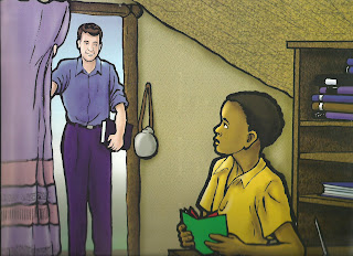 ( fig. 5) Certo dia, MADUGU notou que a porta do escritório do missionário estava aberta. De fora, podia ver o Livro sem Palavras sobre a mesa. E MADUGU não pensou muito, entrou na ponta dos pés e sabe o que aconteceu? Ele pegou o livro. Era a primeira vez que ele tocava naquelas páginas coloridas. Neste momento ouviu um barulho atrás dele e depressa virou. Era o missionário que estava olhando para MADUGU. MADUGU levou um susto ao ver o missionário e disse: - Eu... Eu só estava dando uma olhadinha neste livro. O missionário sorriu pra ele e disse: - Tudo bem, não se preocupe MADUGU, vejo que sua perna está boa e você poderá ir pra casa amanhã. - Amanhã!!! – Exclamou MADUGU. Sem pensar, MADUGU disse ao missionário: -