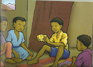 (fig. 6) MADUGU de vez em quando olhava para trás enquanto descia a estrada dando tchau. Então quando ninguém mais o via andou bem depressa, e estava muito feliz. Segurava o livrinho sem palavras com orgulho e, a medida que ia andando, ia repetindo os versículos que aprendeu com o missionário. Quando se aproximou da aldeia, sua família ficou muito alegre ao vê-lo, e seus três irmãos perguntaram: - O que é isso que você ganhou? - Deixe a gente ver essas cores! Enquanto isso, MADUGU conservava o livrinho fechado. - Hoje à noite irei falar para vocês deste livro que fala. Assim que terminou o jantar, os meninos perguntaram: - Não está na hora? Está! Ou não está? - Sim! – Disse MADUGU.