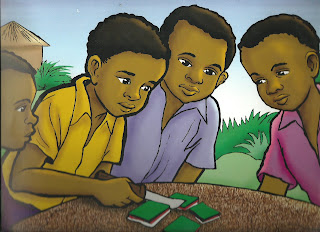 ( fig.1) MADUGU ao ver de longe a casa dos missionários, deu um grande suspiro. MADUGU sabia que na casa dos missionários tinham remédios, mas eles eram cristãos. E MADUGU disse para si mesmo: - Eu sou um mulçumano! Nós mulçumanos não devemos deixar que estes cristãos toquem em nós. Apesar disso MADUGU sabia que alguns amigos dele tinham ido até lá na casa dos missionários e tinham sido sarados. E pensou... - Aqueles missionários são como anjos aqui na terra.